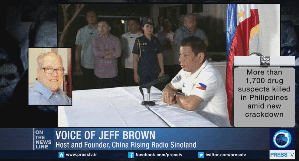 Jeff J. Brown, author, analyst and lecturer on China Rising Radio Sinoland is interviewed on Press TV‘s On the News Line program. Today’s feature is about new Philippines President Rodrigo Duterte lashing out at the United Nations for criticizing the more than 1,700 drug killings taking place in this archipelago, since he took office in June. Watch the first five minutes of this news program to see what it is all about: