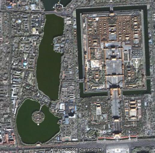 Pictured above is China’s ancient “Center of the Universe”, the Forbidden City, which for millennia served as the seat of government for China. North is up. The massive Forbidden City is the big rectangle at two o’clock and includes all the buildings below it, until the big horizontal boulevard, the famous Chang’an Avenue, which divides Beijing north and south. The left half of the photo, with the lakes is Zhongnanhai, where China’s national government leaders live and work. At the bottom of the Forbidden City can be seen Tiananmen Gate (in red), upon which Chairman Mao Zedong stood on October 1st, 1949, announcing New China’s liberation from Western imperialism and fascism. The very northern part of Tiananmen Square can be seen just below Tiananmen Gate, on the south side of Chang’an Avenue, in the lower right hand corner. (Image by DigitalGlobe)