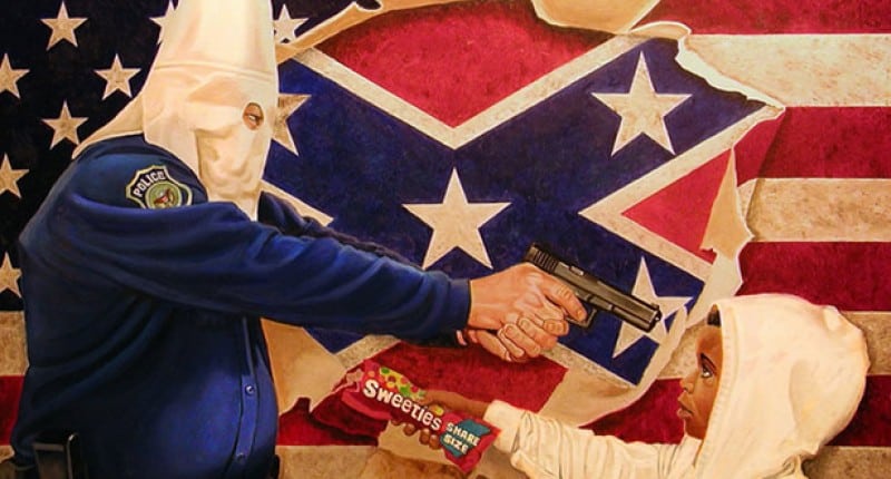 Painting by Michael D’Antuono, who was inspired by the racist murder of 17-year old Trayvon Martin, shot dead by rent-a-cop George Zimmerman, in Florida, in 2012. Zimmerman was acquitted in court and is now free, working as an insurance underwriter. Since then, US police are shooting people of poverty and color with impunity. They almost never even get tried in court anymore. They are just transferred to another department or suspended for a week or two, with full pay, to go back out on the streets again, guns in hands .