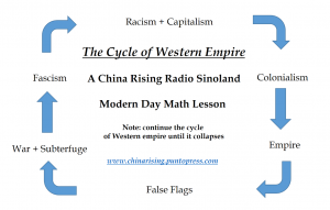 Western Empire visually portrayed in its unvirtuous cycle… Racism + Capitalism [wc_fa icon=”arrow-right” margin_left=”” margin_right=””][/wc_fa] Colonialism Colonialism [wc_fa icon=”arrow-right” margin_left=”” margin_right=””][/wc_fa] Empire Empire [wc_fa icon=”arrow-right” margin_left=”” margin_right=””][/wc_fa] False Flags False Flags [wc_fa icon=”arrow-right” margin_left=”” margin_right=””][/wc_fa] War + Subterfuge War + Subterfuge [wc_fa icon=”arrow-right” margin_left=”” margin_right=””][/wc_fa] Fascism Fascism [wc_fa icon=”arrow-right” margin_left=”” margin_right=””][/wc_fa] Racism +…